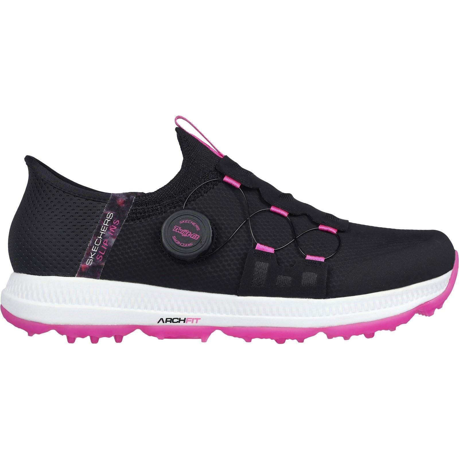 The Skechers Slip-ins: GO GOLF Elite 5 - Slip 'In is made with our exclusive Heel Pillowâ„¢. This waterproof golf design features a synthetic upper with a unique Twist Fit closure, a removable Arch Fit insole and GRIPFLEX spikeless traction outsole.